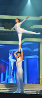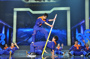 歌伴舞《和諧大家庭》唱出了全體興業(yè)人圍繞在集團(tuán)領(lǐng)導(dǎo)班子周圍,和衷共濟(jì)、共謀發(fā)展的激情與和諧,也將晚會(huì)引入“和諧興業(yè)展龍圖”的篇章。社區(qū)的中老年朋友們自編自演的舞蹈《映山紅》形式歡快喜慶,展現(xiàn)了興業(yè)社區(qū)中老年人的良好精神風(fēng)貌;興業(yè)進(jìn)出口公司請(qǐng)來的三位漂亮的俄羅斯美女引爆全場(chǎng)激情,他們就是來自俄羅斯的組合“莫斯科女孩”,他們演唱新穎獨(dú)特,外形性感甜美,載歌載舞,她們演唱的《紅梅花兒開》、《SUPER STAR》,引起全場(chǎng)雷動(dòng)歡呼;同德礦業(yè)公司選送的雜技《肩上芭蕾》驚險(xiǎn)刺激,來自北京雜技團(tuán)的年輕演員們?cè)谕榧绨蛏线~起輕盈的舞步,場(chǎng)下觀眾驚呼不已,拍手叫絕;臨汾志強(qiáng)鋼鐵公司的漢子們表演的威風(fēng)鑼鼓《堯天舜日》高亢激昂,令觀眾們心潮澎湃,更激發(fā)了大家開創(chuàng)美好未來的激情和斗志。